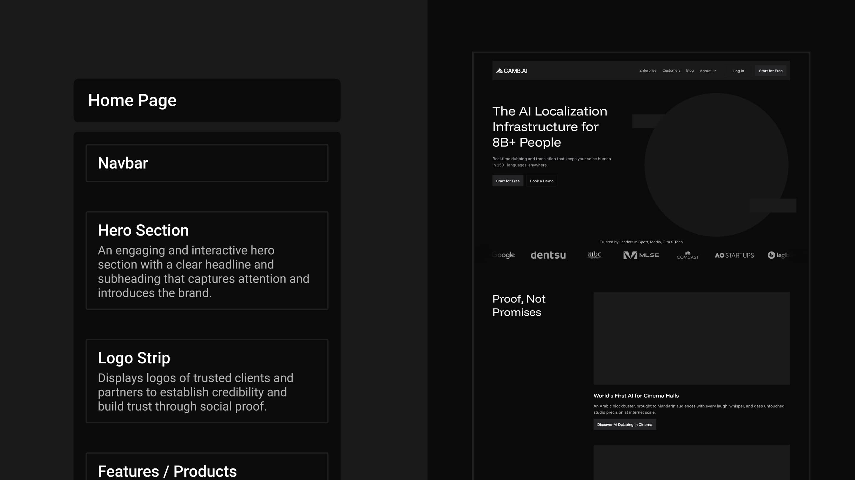 Each section was designed to answer one business question: why camb.ai, why now, why enterprise.